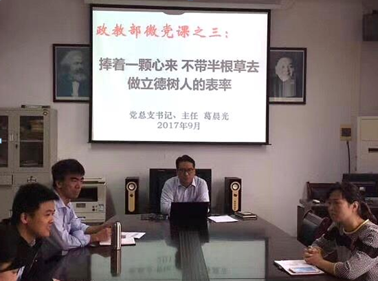 9月5日,在第33个教师节来临之际,政教部党总支书记、主任葛晨光为全体党员上了一堂生动感人的专题微党课,让广大党员深受教育和震撼。与会同志一致表示,思政课教师承担着光荣而又神圣的使命,要自觉加强师德师风建设,坚持教书和育人相统一,坚持言传和身教相统一,努力做大学生健康成长指导者和引路人。