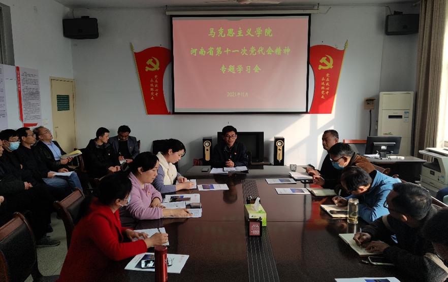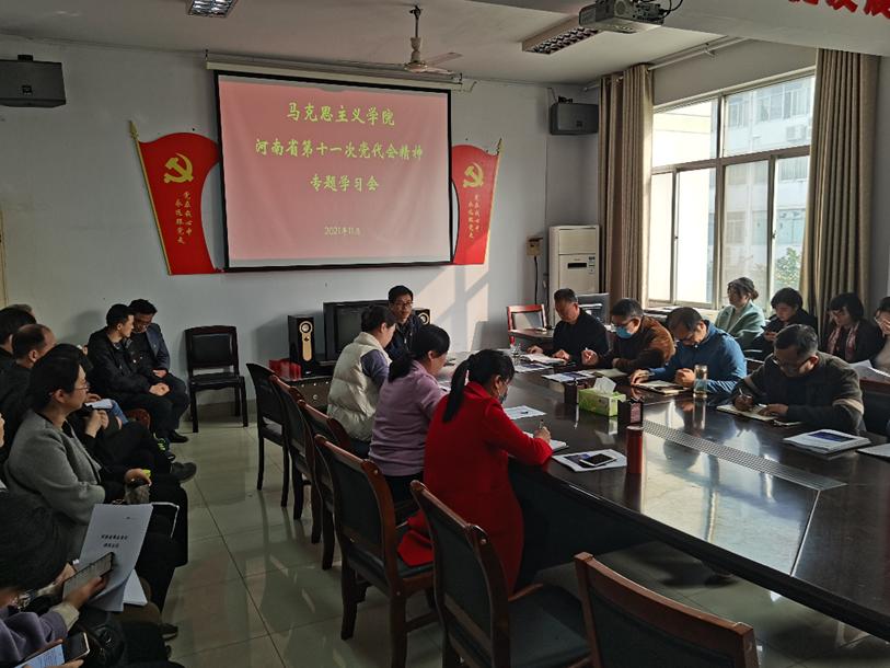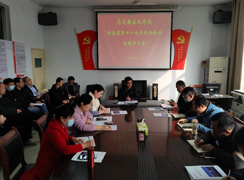 2021年11月2日下午,马克思主义学院学习河南省第十一次党代会精神专题学习会在学院会议室如期举行,学院党总支书记彭民工同志首先做了发言,向大家传达了此次党代会的主要内容和会议精神。