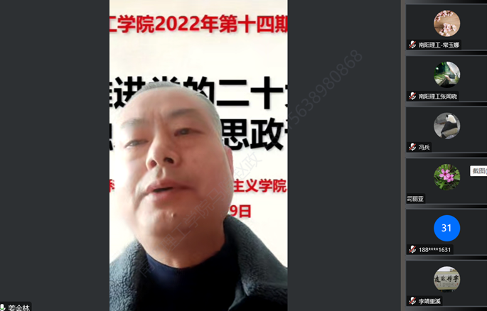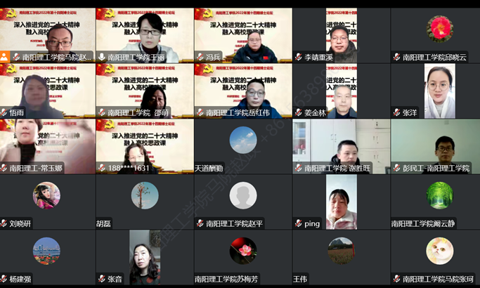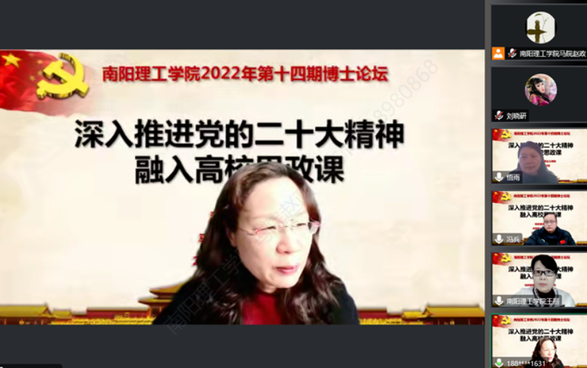 本网讯(特约记者/赵政)12月29日,南阳理工学院第十四期博士论坛暨“深入推进党的二十大精神融入高校思政课”学术研讨会以线上方式举行。副校长张爱红教授致辞,四川大学冯兵教授作主旨报告,马院彭民工书记、姜金林院长分别发言,马院全体博士教师及对本次论坛感兴趣的老师与会并积极发言交流,马院副院长王丽主持论坛。