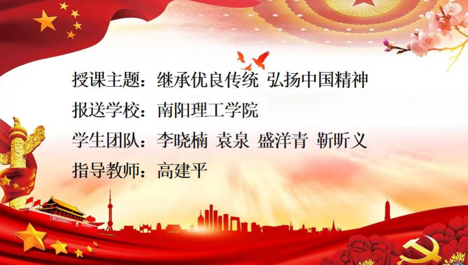 参赛作品由李晓楠、袁泉、盛洋青、靳昕义四位学生完成,马克思主义学院青年教师高建平具体指导。作品旨在从“是什么、为什么、怎么做”三个方面,引导广大青年朋友在潜移默化中学习中华优秀传统文化,不断增强民族责任感、认同感、使命感,让大家切身体会中国精神对个人发展与综合国力的重要推动作用,从而鼓舞广大新青年努力实现个人理想,以小我推动大我,在实现中国梦的道路上,贡献出属于自己的一份力量。