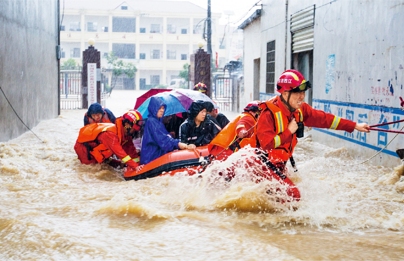2020年7月8日,江西省九江市都昌县大港镇盐田中学师生因山洪被困,九江市消防救援支队消防员利用橡皮艇转移受困人员。8月31日,中央宣传部向全社会发布了江西省九江市消防救援支队的先进事迹,授予他们“时代楷模”称号。 新华社发 傅建斌/摄