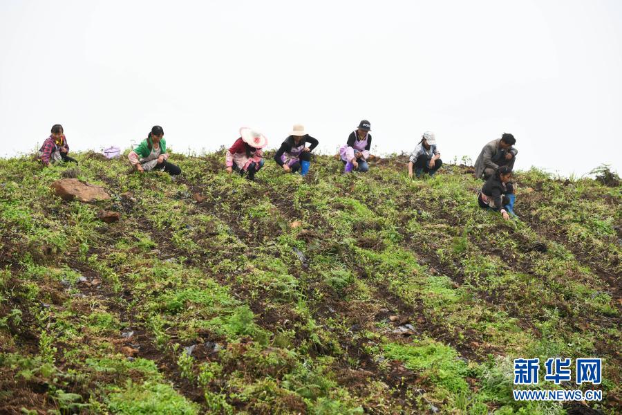 农民在贵州省普安县地瓜镇屯上村的“扶贫茶园”里给茶苗除草(2019年7月7日摄)。当地的茶园栽种有浙江安吉黄杜村捐赠的白茶苗。新华社记者 杨文斌 摄