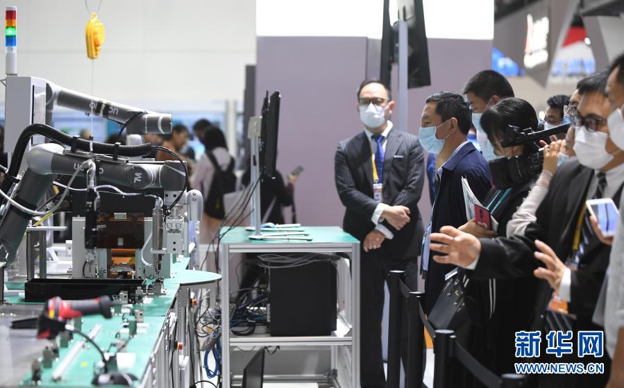 2020年11月6日,在进博会技术装备展区,人们在西门子展台观看人机协作的智能化单元生产线。新华社记者 李任滋 摄
