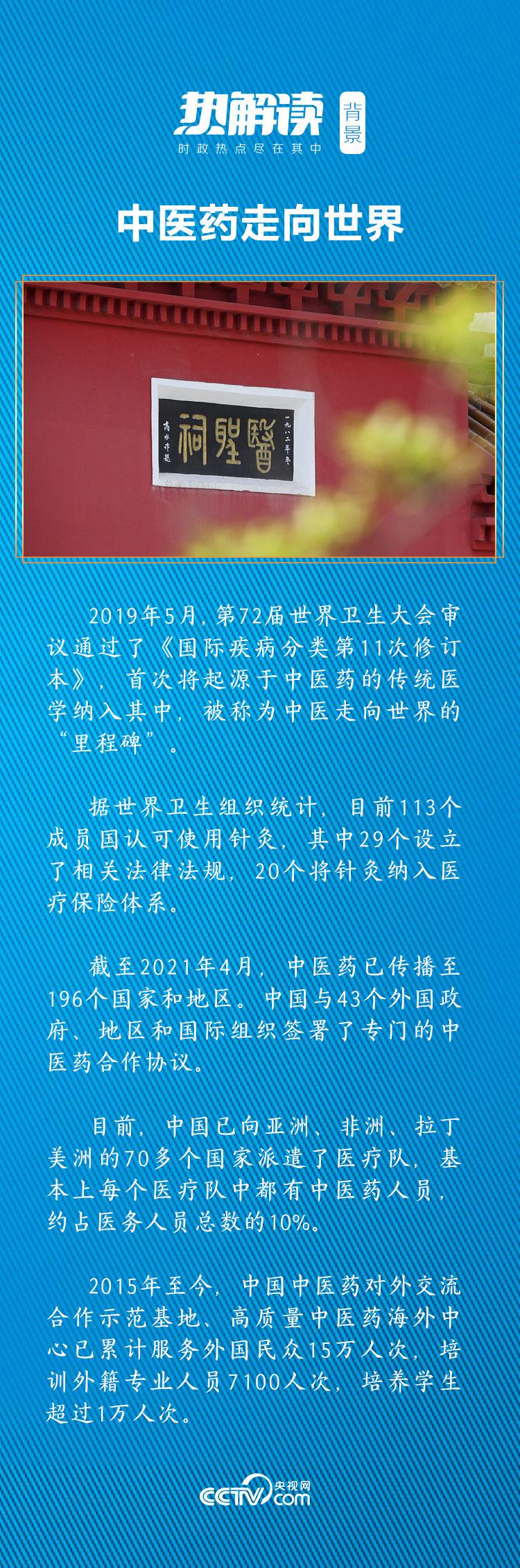 如今,《黄帝内经》《本草纲目》被联合国教科文组织列入世界记忆名录;中医针灸、藏医药浴法被分别列入人类非物质文化遗产代表作名录;中国药学家屠呦呦受中医典籍启发,用现代科技手段提取出青蒿素,从而获得诺贝尔奖。截至2021年4月,中医药已传播至196个国家和地区。