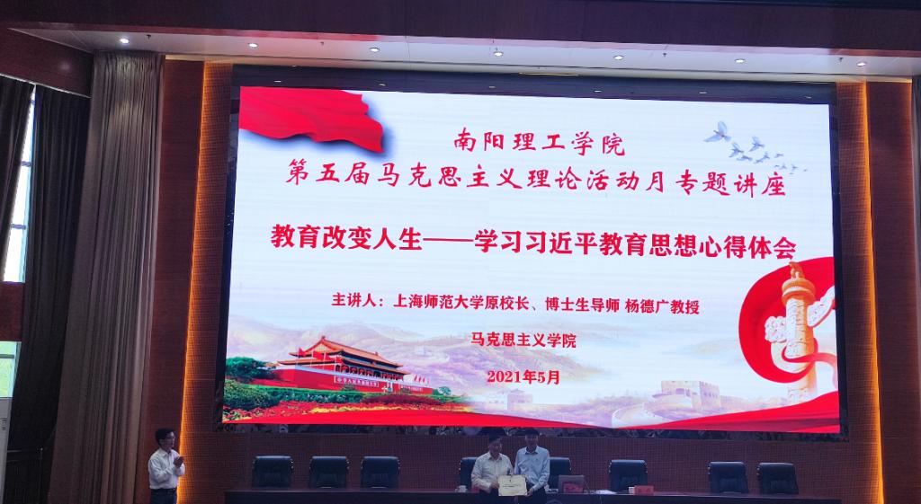 为深入学习贯彻习近平总书记关于教育的重要论述,扎实开展党史学习教育,5月20日,我院邀请上海师范大学原校长、博士生导师杨德广教授为我校学生作了题为《教育改变人生》的专题报告。报告会由马克思主义学院党总支书记彭民工主持,南阳理工学院党委副书记、工会主席张伟教授出席报告会,并颁发兼职教授聘书。