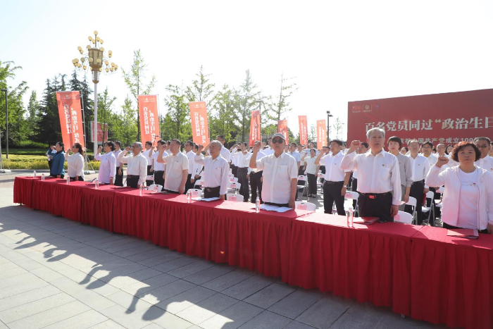 “我志愿加入中国共产党……”面对鲜红的党旗,全体党员集体重温了入党誓词。