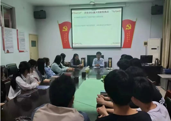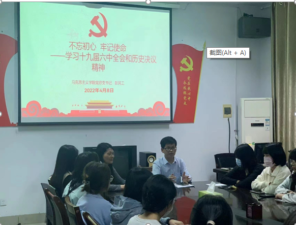 为深入贯彻党的十九届六中全会精神,扎实推动马克思主义理论社团建设,以优异成绩迎接党的二十大胜利召开。4月8日晚,马克思主义学院在学院会议室为新新青年学社举办时政报告会。学院党总支书记彭民工以“不忘初心、牢记使命——深入学习贯彻党的十九届六中全会和历史决议精神”为题,为青年学子作了一场精彩报告。