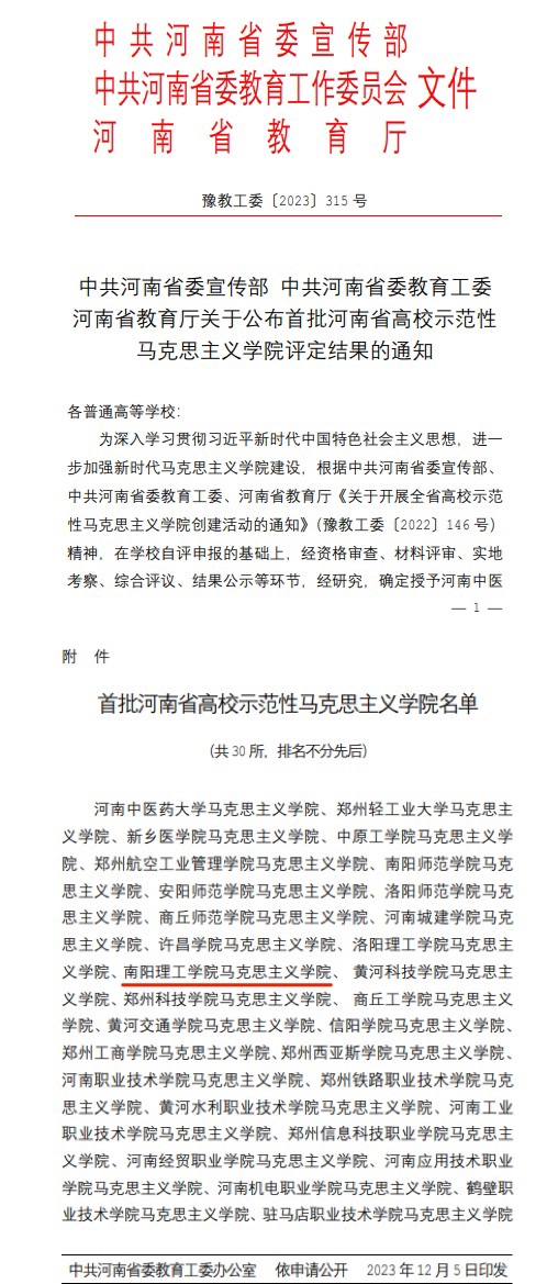 本网讯(特约记者/赵政)近日,中共河南省委宣传部、中共河南省委教育工委、河南省教育厅联合印发《关于公布首批河南省高校示范性马克思主义学院评定结果的通知》(豫教工委〔2023〕315号),我校马克思主义学院被授予首批“河南省高校示范性马克思主义学院”称号。