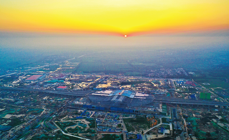 “十三五”时期,全国上下坚定不移贯彻新发展理念,努力破解发展难题、厚植发展优势,推动我国进入了高质量发展阶段。图为2020年8月13日,京雄城际铁路雄安站施工现场(无人机照片)。 新华社记者 牟宇/摄