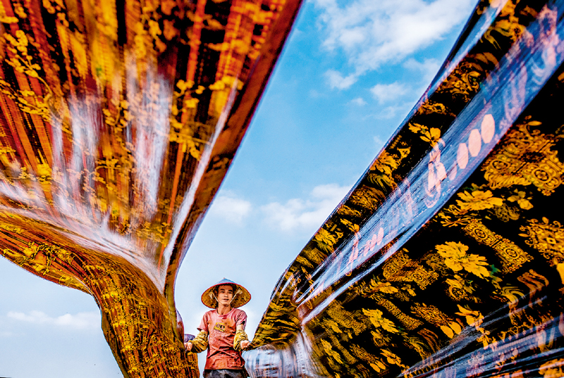 在新发展理念指引下,我国经济发展质量不断提高,传统产业焕发新生。图为2020年12月4日,广东省佛山市顺德区伦教镇香云纱染整场,工人们趁晴好天气在制作、晾晒香云纱。香云纱俗称莨绸、云纱,是一种用地方特色植物薯莨的汁水对桑蚕丝织物进行浸染、再用珠三角地区特有的含矿河涌塘泥涂层覆盖、经晾晒而成的一种昂贵纱绸制品。香云纱染整技艺也是第二批中国国家级非物质文化遗产之一。 人民图片 邱新生/摄