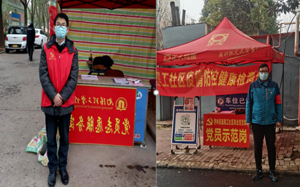 图为学院党总支书记彭民工,组织员杨柯,在学校党员志愿服务岗值班。