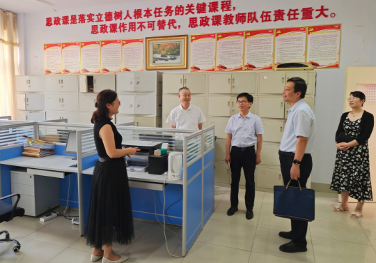 在听课环节,董豪分别认真听取了青年教师郭苏豫讲授的《中国近现代史纲要》和王珊讲授的《毛泽东思想和中国特色社会主义理论体系概论》课程。课后,董豪与任课教师进行了亲切交流,对课堂教学情况予以肯定,对改进教学方法、提高课堂教学质量等方面提出指导性的意见和建议。在马克思主义学院,董豪详细察看学院办公条件、文化建设和氛围营造情况,深入教研室看望慰问思政课教师,悉心了解教师们关注的热点问题。