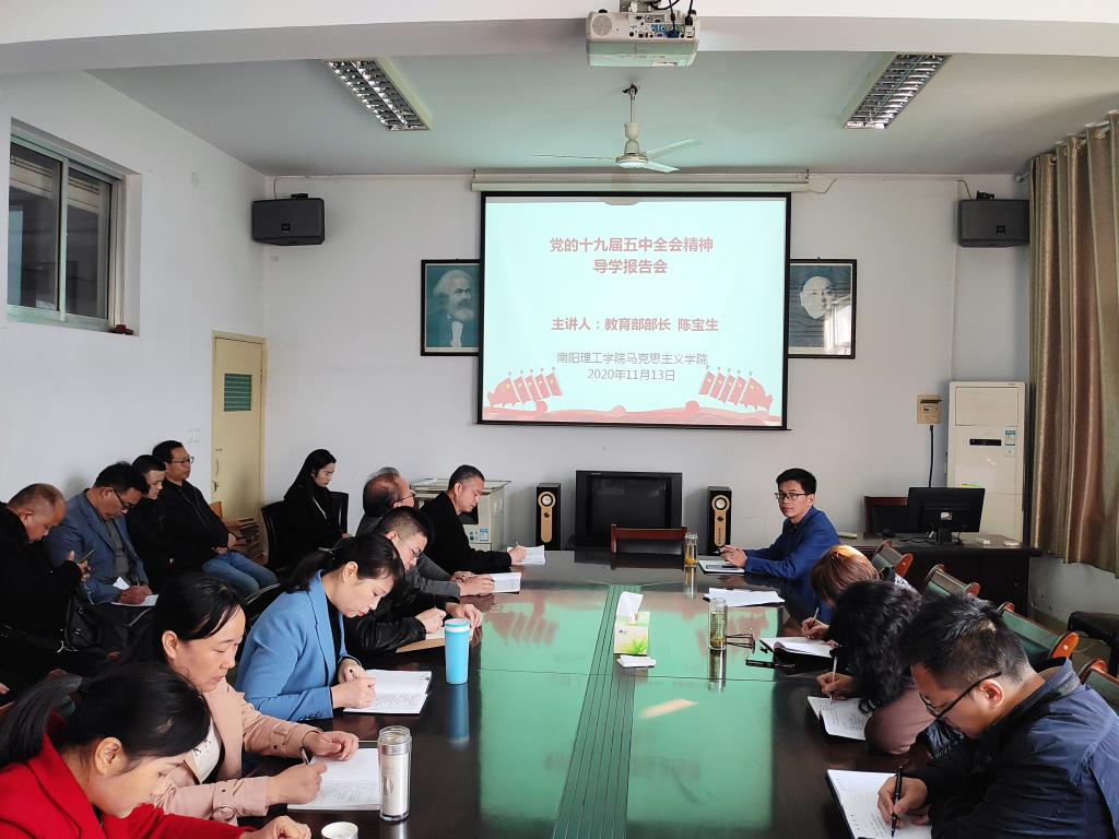 11月13日,马克思主义学院全体党员教师,专题学习党的十九届五中全会精神。会前,党员教师围绕《中国共产党第十九届中央委员会第五次全体会议公报》等学习内容进行了自学。会上,老师们首先认真聆听了由中央宣讲团成员、教育部部长陈宝生作的关于“党的十九届五中全会精神”导学报告会,封闭视频观看完毕后,教师们分别就学习五中全会精神的体会和认识,结合自己的工作进行了发言。