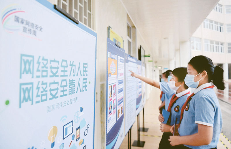 2020年9月14日,河北省石家庄市桥西区草场街小学的学生在观看网络安全知识展板。 新华社记者 王晓/摄