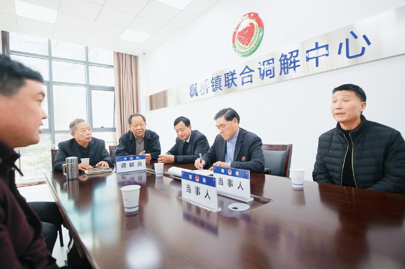 “枫桥经验”是创新群众工作方法,善于运用法治思维和法治方式解决涉及群众切身利益矛盾和问题的典范。图为2019年4月1日,在枫桥镇联合调解中心,工作人员在调解一起合资纠纷。 新华社记者 翁忻旸/摄