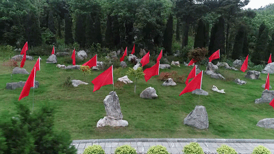 纪念林区的每一面红旗旁,都安葬着一位红军英烈,旁边的石头上刻有编号。(总台央视记者李福远、何柏霖拍摄)