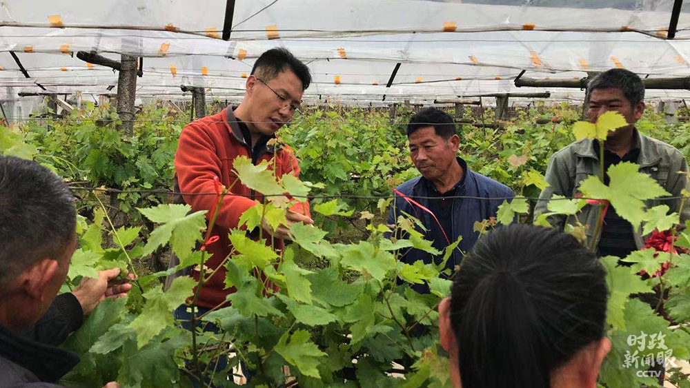 郑吉祥(左二)是桂林市农业农村局技术员,当天他在葡萄园为总书记作介绍。(总台央视记者许达拍摄)